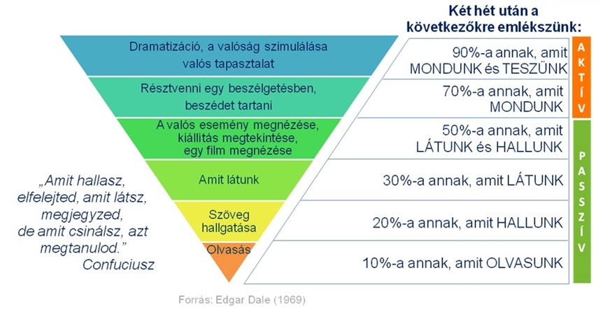 Sok helyen találkozhatsz ezzel a listával (tanulási piramis / tölcsér). Fontos: a konkrét százalékok nem tekinthetők kőbe vésett tudományos ténynek, viszont az üzenetük nagyon hasznos: